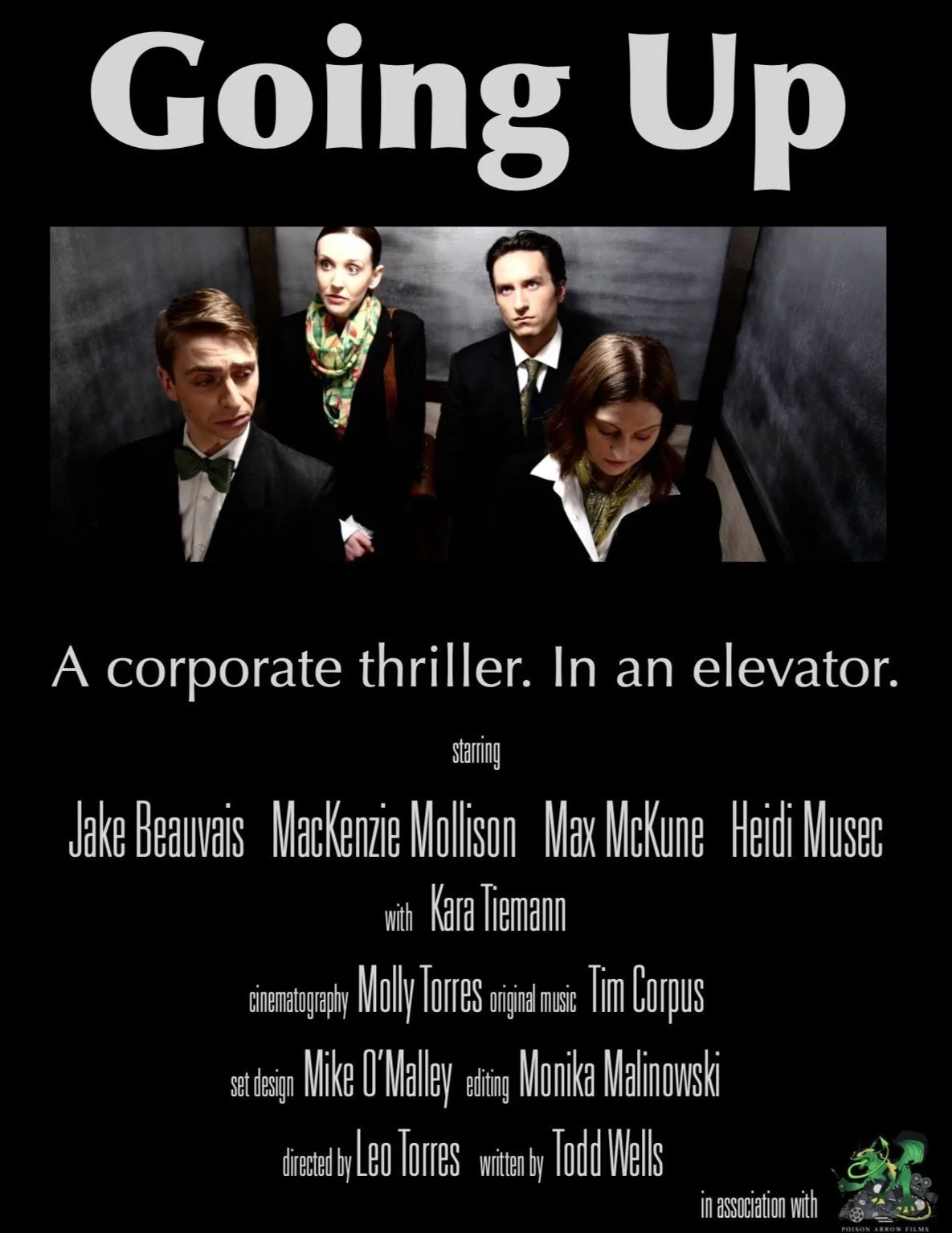 Going Up is a dark and comic corporate thriller, transplanted from the usual decadence of the corner office into the claustrophobic confines of an elevator. The film follows four up-and-coming executives who have learned that a higher-up in the firm engaged in some financial shenanigans, while also knowing that someone else is going to take the fall. Together, they scheme how to best avoid trouble for themselves.
